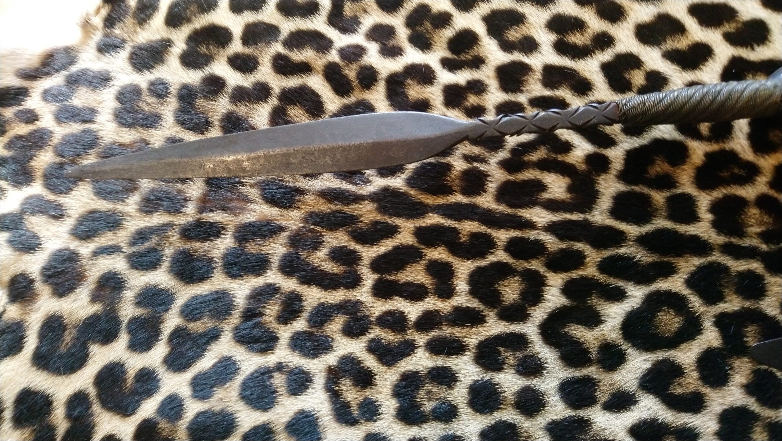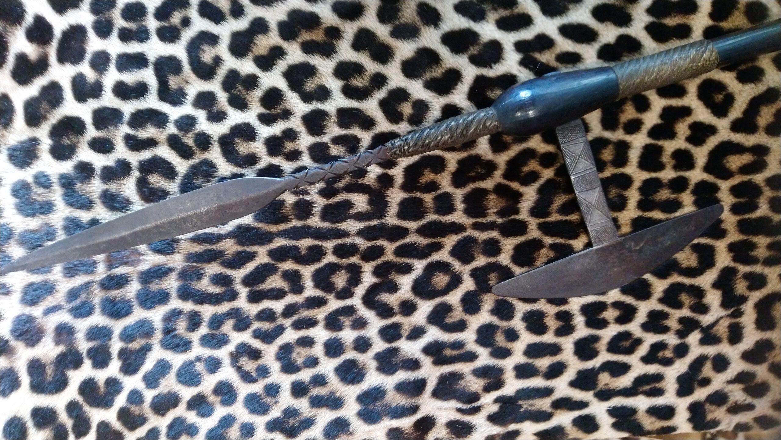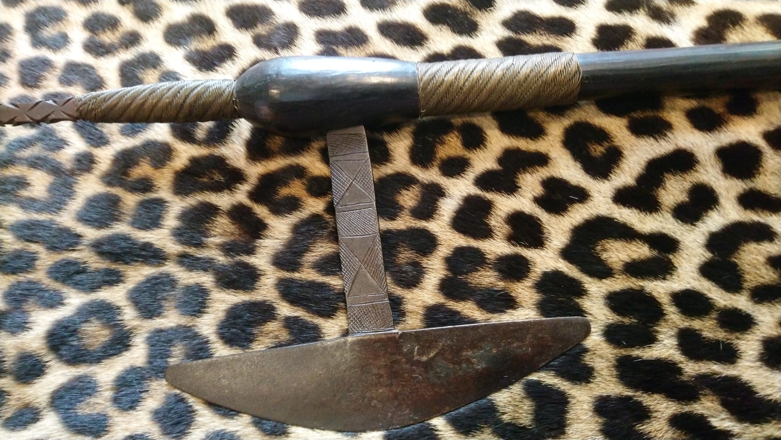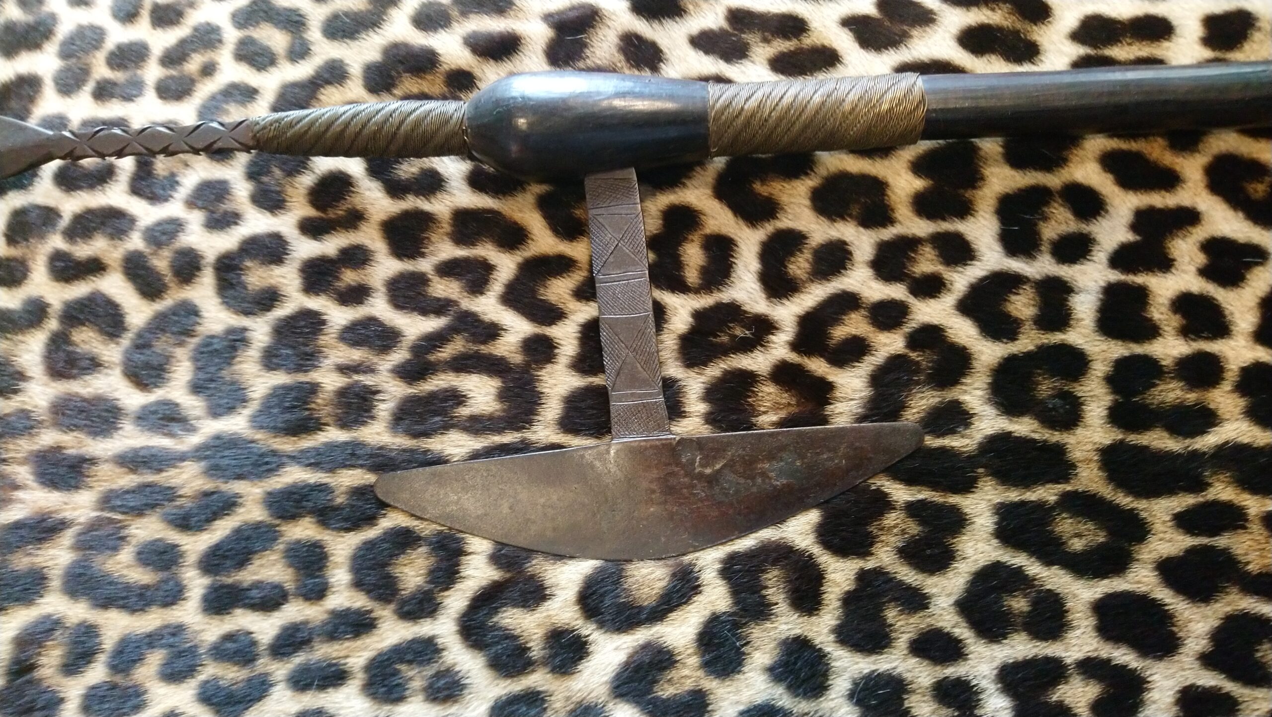 • Spear-Tip Extension: Exceptionally rare in this configuration, a secondary tang rises vertically from the head, culminating in a leaf-shaped spear tip with a reinforced midrib. This “spear-axe” hybrid signifies the highest social rank, likely belonging to a Chief (Ishe) or a High Spirit Medium (Mhondoro).
