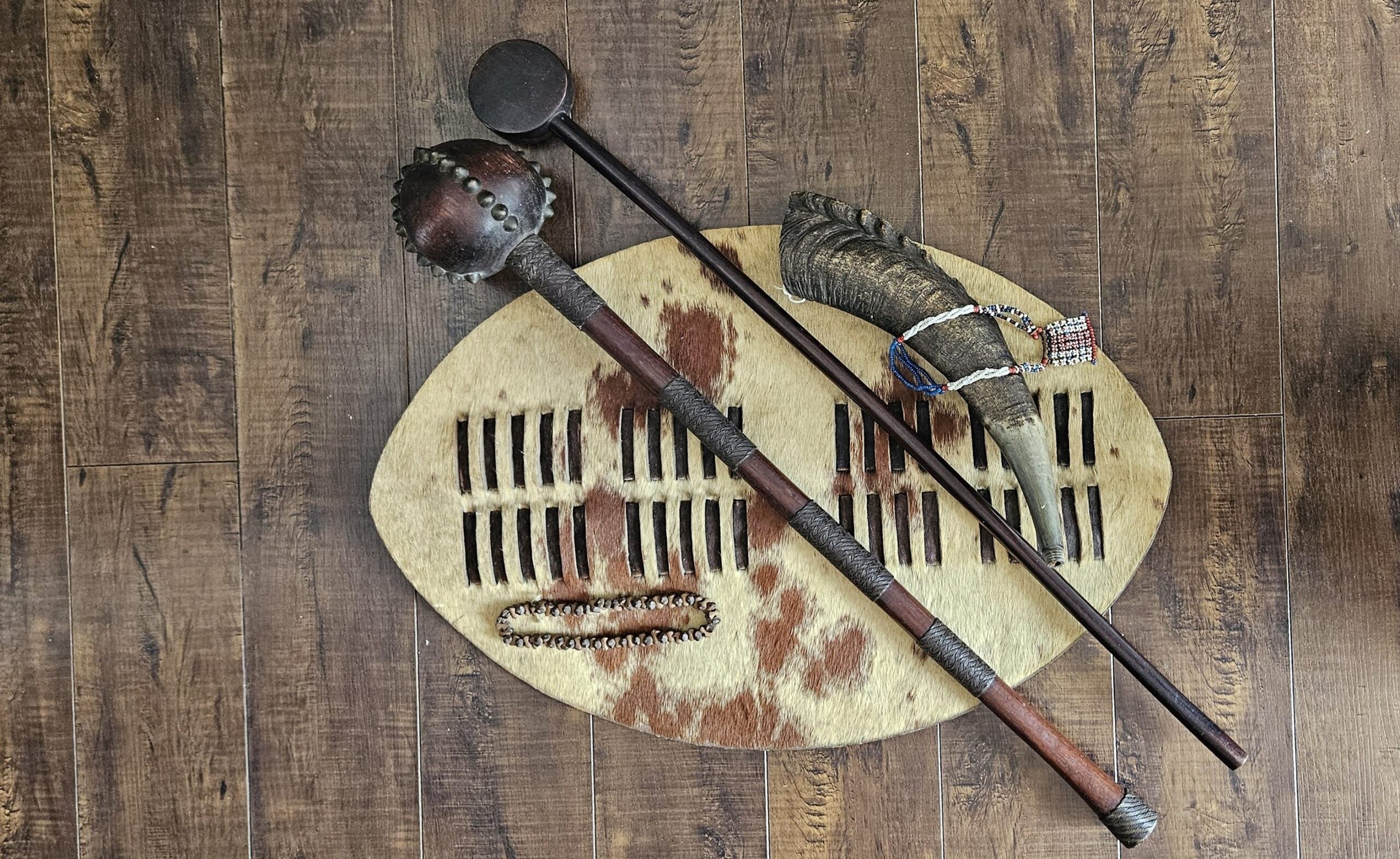 Photos may show display props (shields, horns, etc.) for styling inspiration. This listing includes the knobkerrie and nothing else.