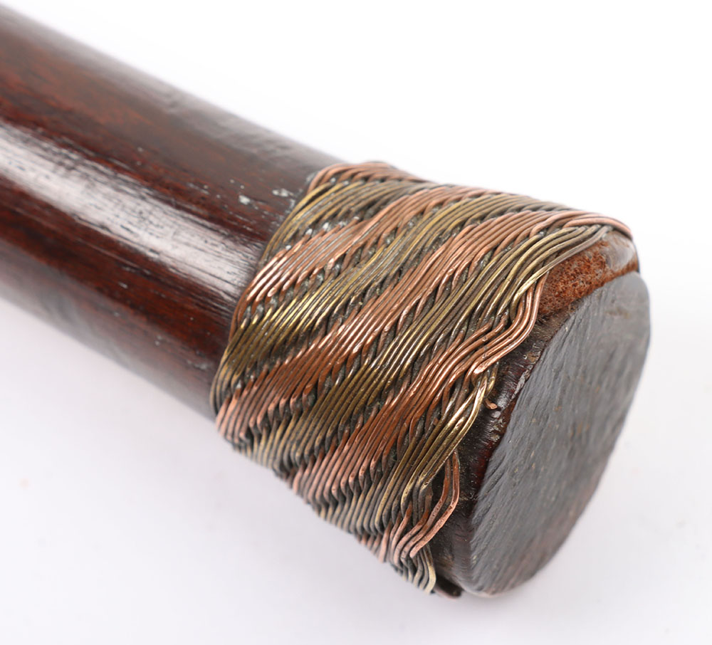 Enter the realm of “Mfecane VI,” the sixth jewel in the revered Mfecane Series from Hills Collectibles; a breathtaking 19th-20th century Zulu Prestige Knobkerrie (iwisa), where deadly functionality meets unparalleled artistic splendor. Carved from the finest dense African hardwood, this piece radiates an aura of refined lethality, its form a harmonious blend of graceful curves and shimmering adornments that belie its potential for devastating impact. Born from the echoes of the Mfecane era; the “Crushing” upheaval that redefined Southern Africa through waves of conquest and migration, it stands as a testament to Zulu craftsmanship, where beauty and brutality intertwine like the intricate wires that grace its shaft.