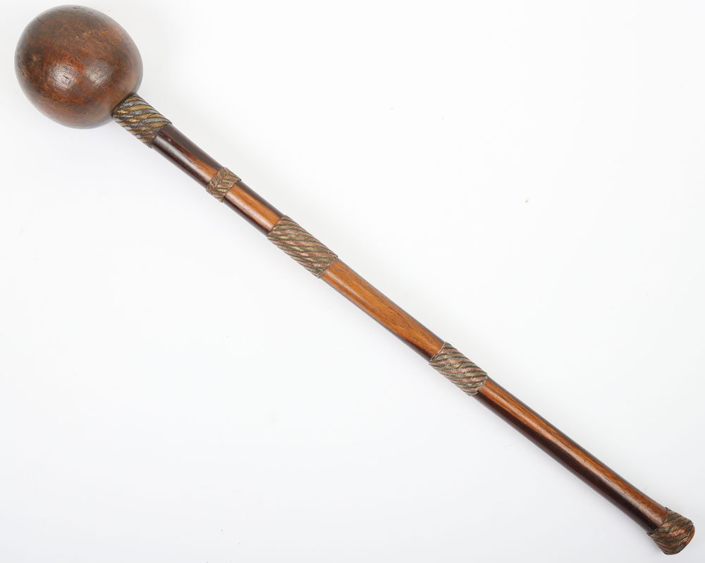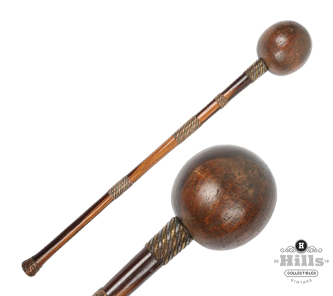 • Head: A flawlessly spherical knob, approximately 4.5-5 inches in diameter, hewn from richly patinated hardwood with a deep, warm brown tone that shifts from mahogany to chocolate under light, its surface smoothed by generations of handling yet marked by subtle grain patterns that add organic texture. Its weight is calculated for a single, terminal blow—a thunderous echo of the “Crushing” era that redefined Southern Africa.