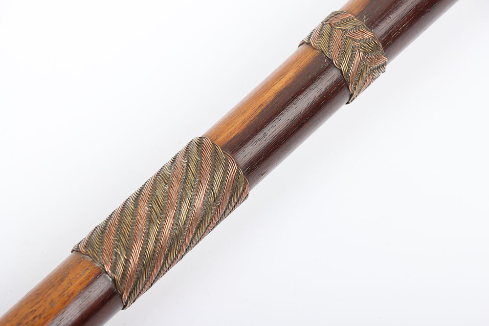 • Tri-Tone Wire Mastery: The crowning glory with multiple bands of intricate, multi-colored wire work in brass, copper, and iron, woven into mesmerizing chevron and zigzag patterns that shimmer with metallic iridescence. Bands adorn the head junction, mid-shaft (in two decorative sections), and butt, not only reinforcing the structure but creating a visual tapestry of colors and textures, a feat of patience and skill that elevates this to an artistic heirloom.
